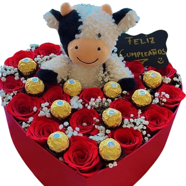 En corazon, en canasta, en cilindro el caso que te ayudamos a diseñar este hermoso arreglo con Peluche, Chocolates y Rosas (Los precios cambian por temporada)