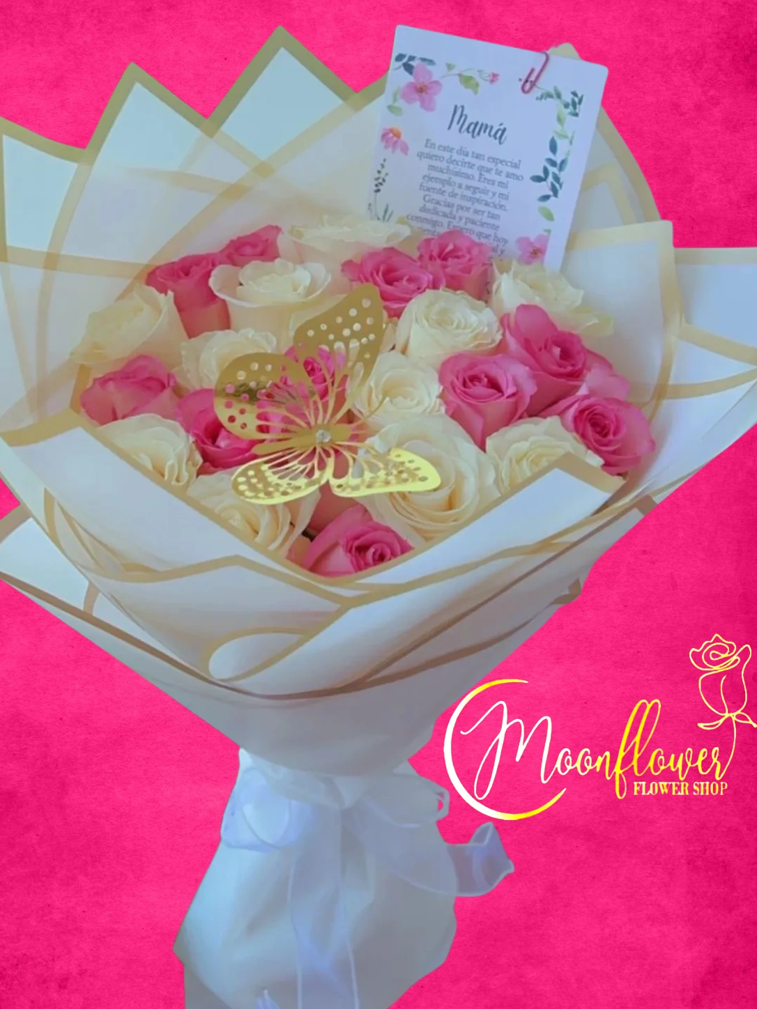 Que seria de nosotros sin esa bella mujer que lo merece todo y no solo el día de las madres. Sorpréndela con este ramo, y una nota de gratitud. Con el Bello Ramo de Rosas 25 Rosas y 25 Blancas